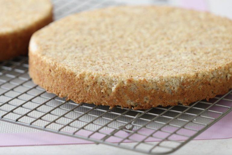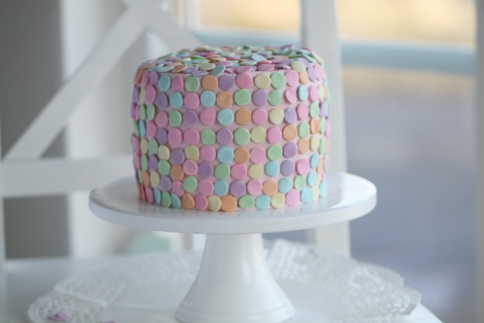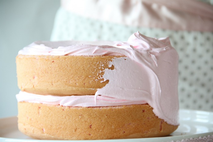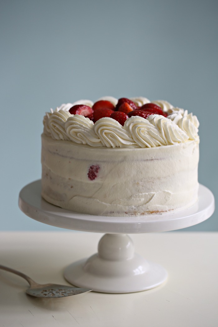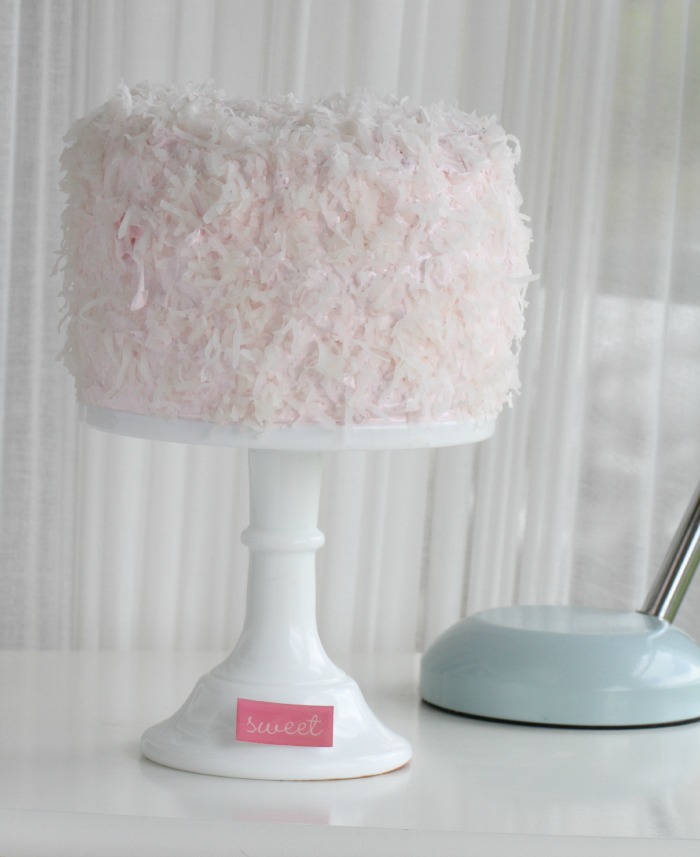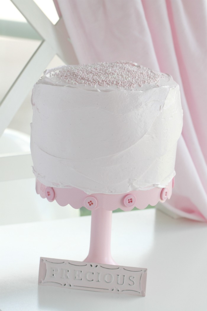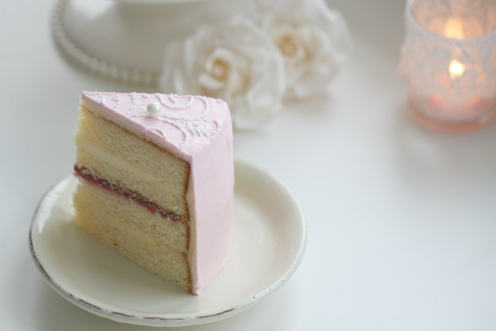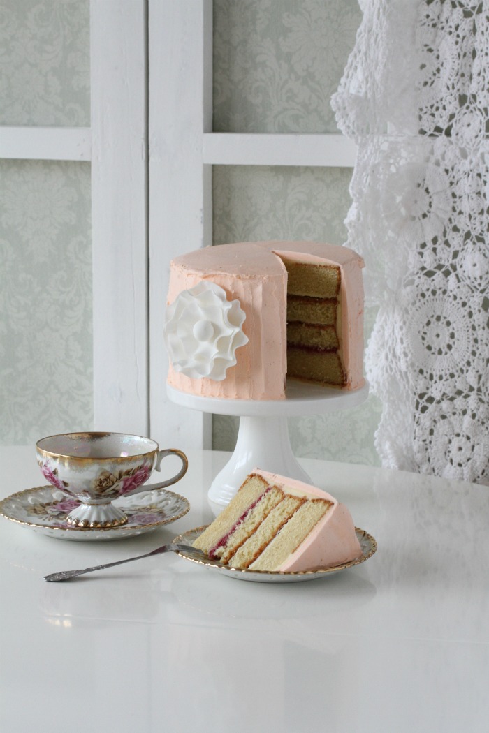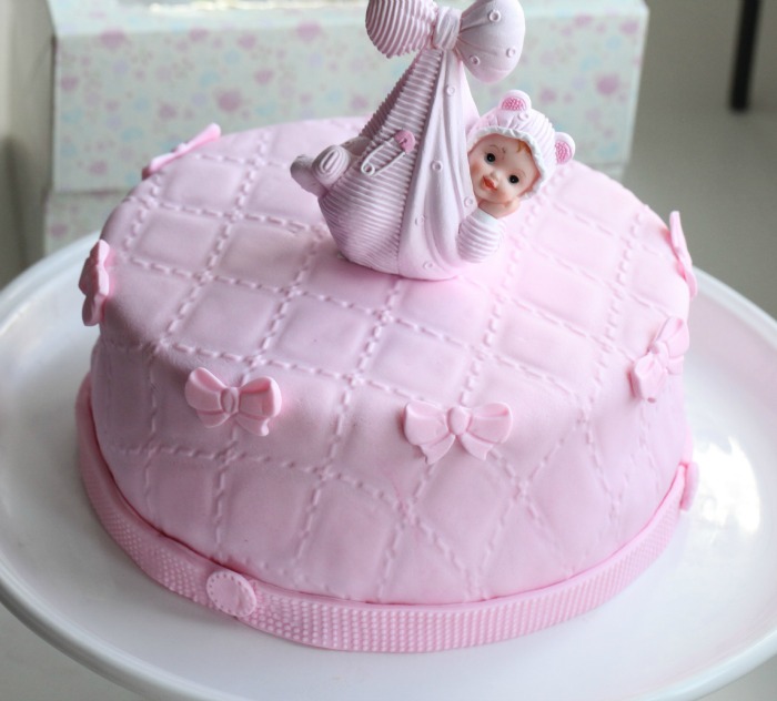 This delicious vanilla cake is perfect for a baby shower. A vanilla cake filled with vanilla cream, raspberry jam and banana, then covered in a white chocolate frosting and pink marzipan.