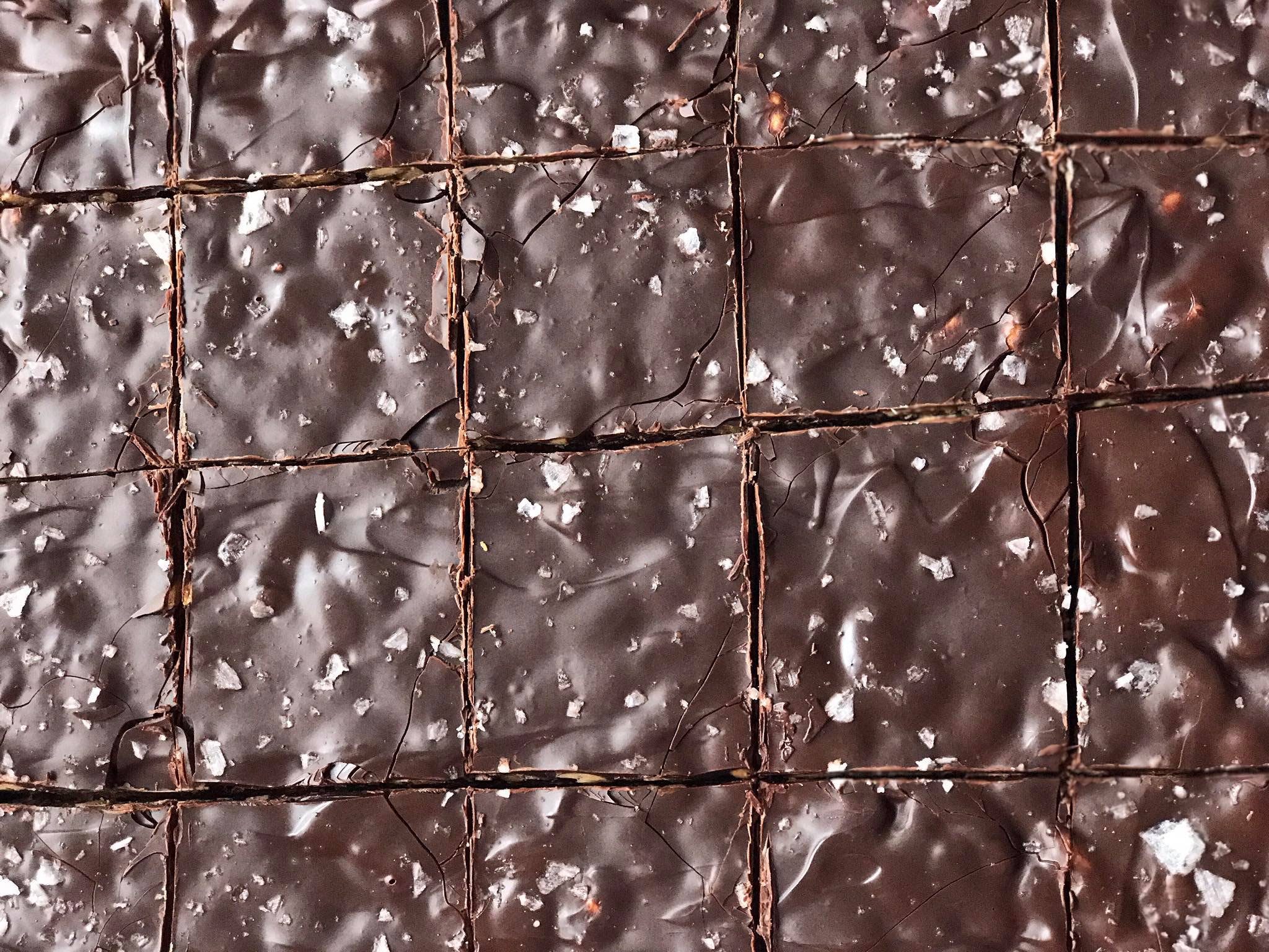 - With an offset spatula spread the chocolate all over the top, and then the magic touch that really makes this snickers bar stand out in taste, drizzle some sea salt on top.
