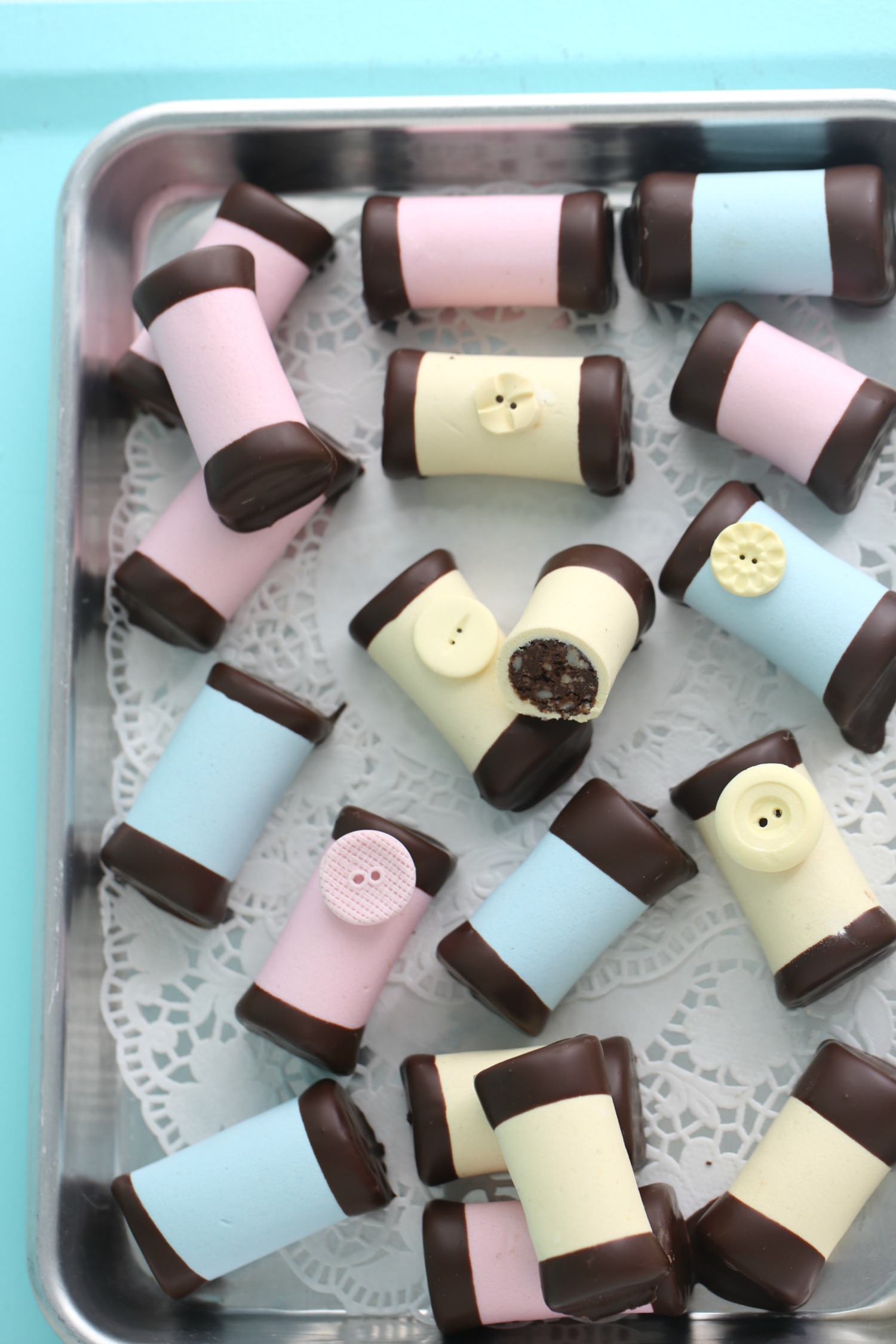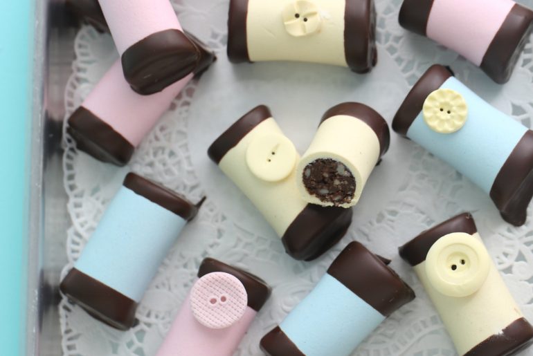 Bakeries save their (cake) leftovers and use them to make a long log wrapped in marzipan. They then cut the log into small pieces and dip each end in chocolate, kind of clever if you ask me.
