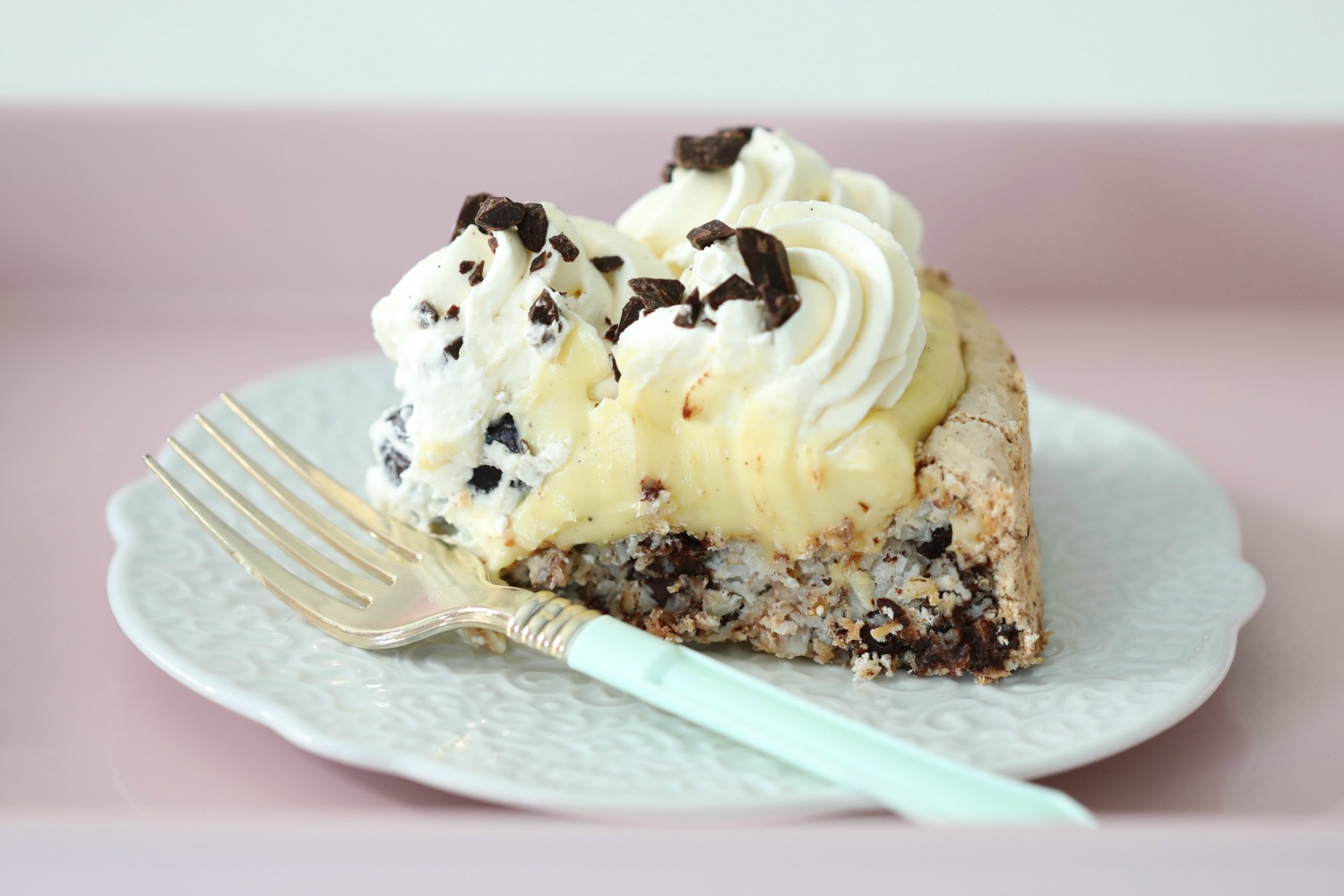 The crust is made from Coconut and chocolate, it is gooey and delicious! It is so topped with homemade vanilla cream, juicy dates and whipped cream that is flavored with vanilla.
