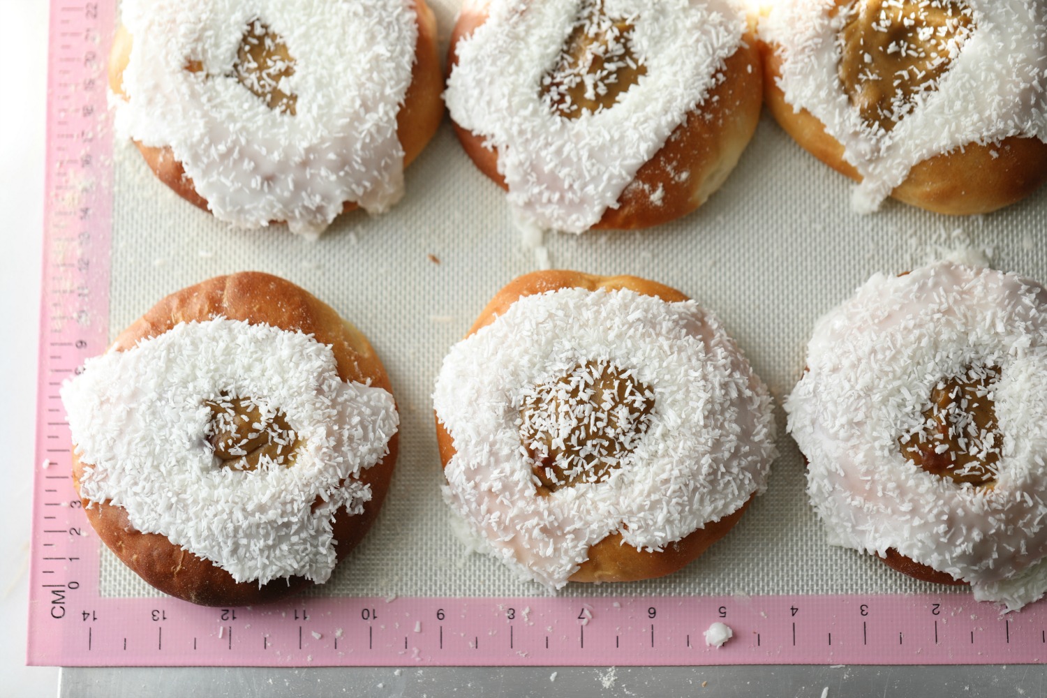 This sweet bun is filled with espresso pastry cream, after it is baked it is drizzled with glaze and the glaze is then dipped into coconut.