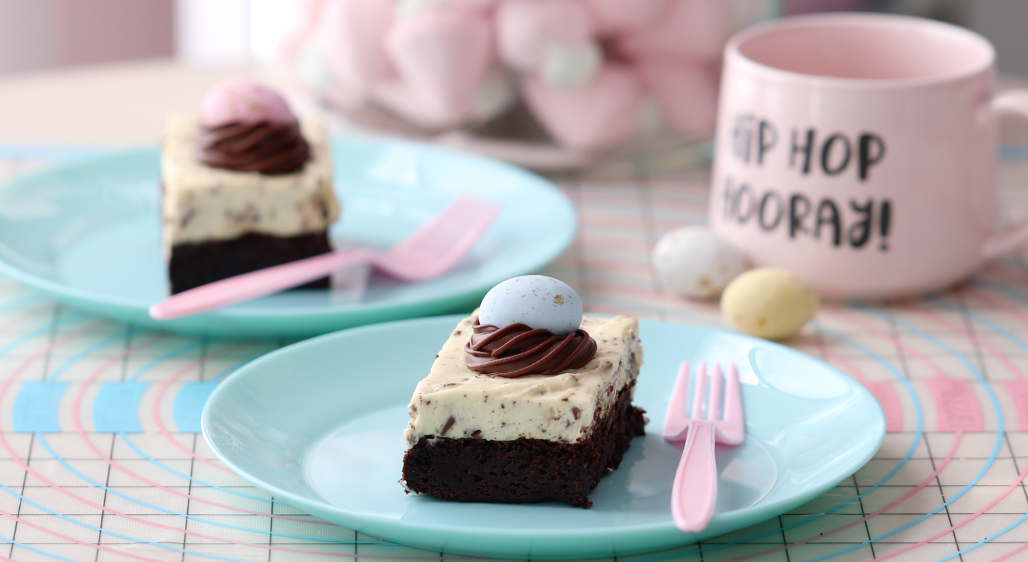The combination of the fudge brownies and the light pastry cream combined with whipped cream and bits of chocolate in it is just heavenly and a perfect Easter dessert!