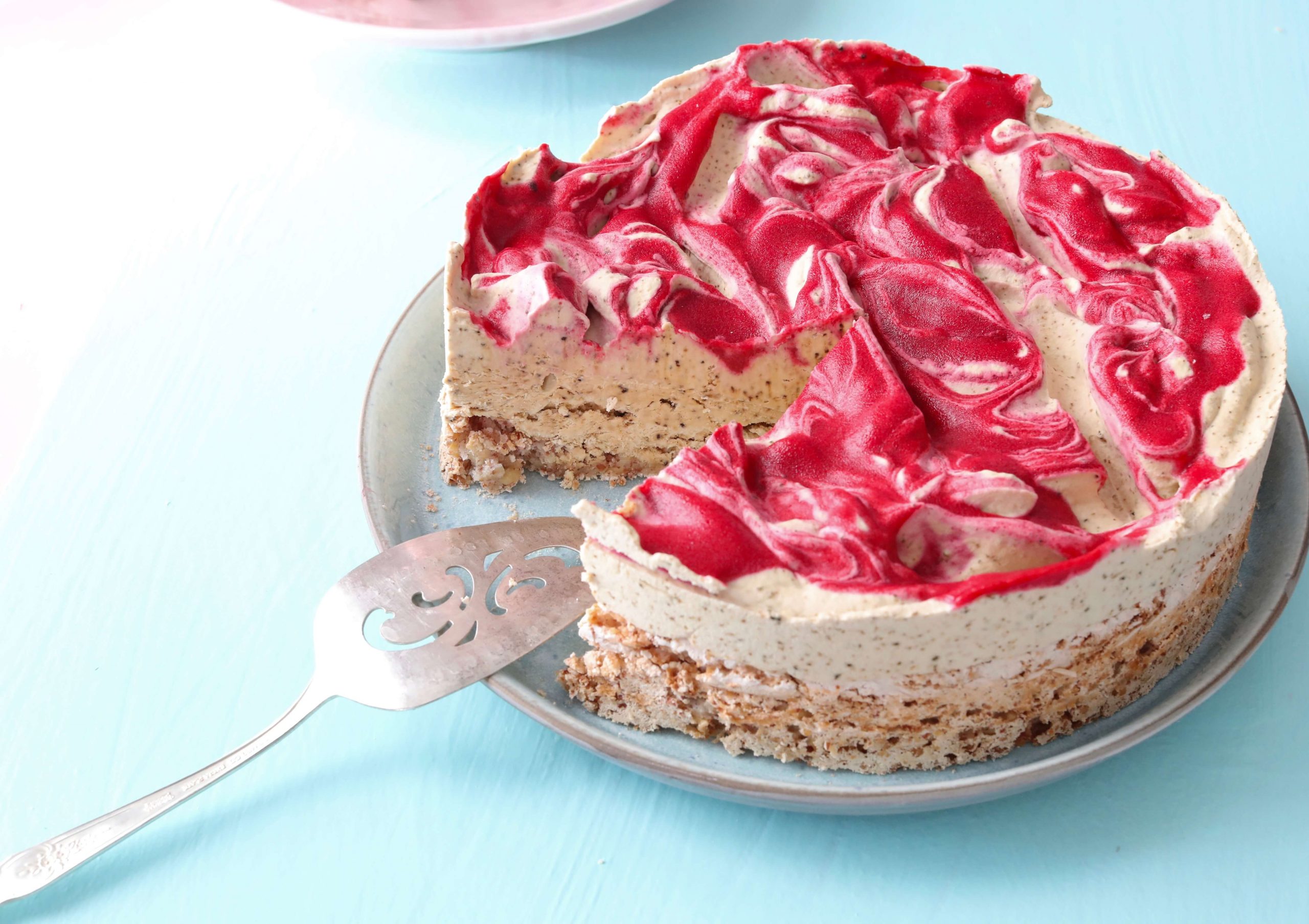 The crust is a gluten-free almond crust, topped with licorice ice cream and swirled raspberry coulis on top.